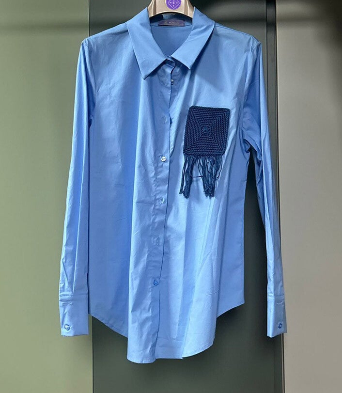 Camicia a manica lunga in cotone, con vestibilità regular che unisce comfort e stile senza tempo. Il design classico viene valorizzato da un taschino applicato realizzato a mano all’uncinetto, arricchito da frange decorative che donano al capo un tocco artigianale e contemporaneo.